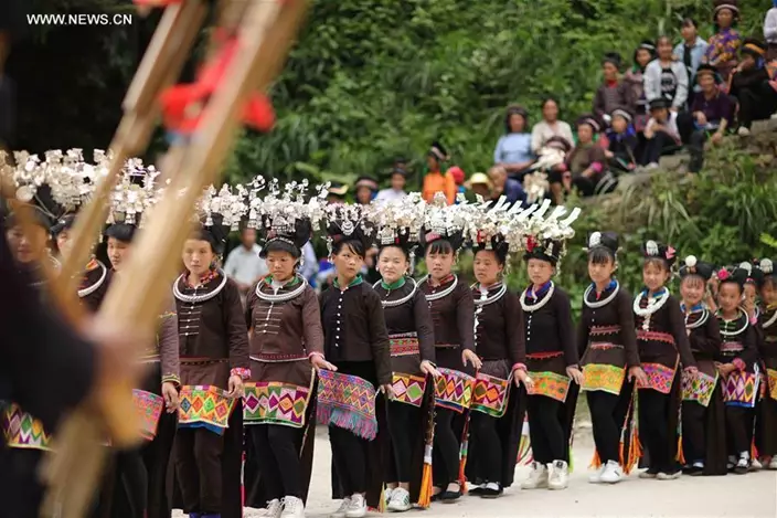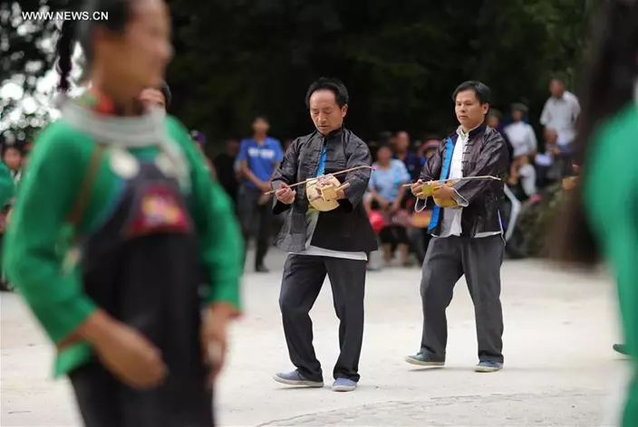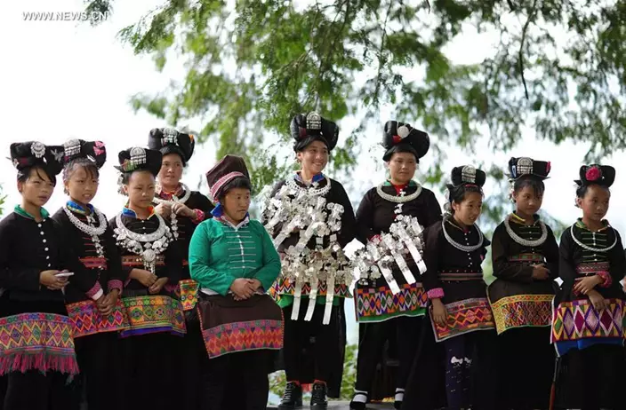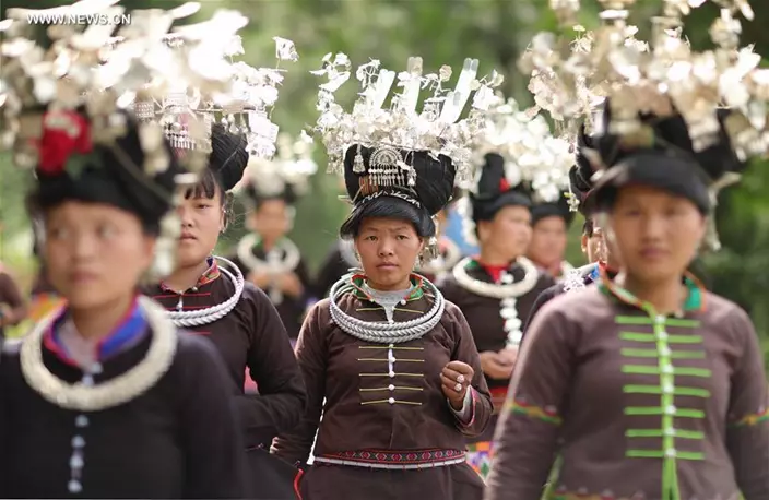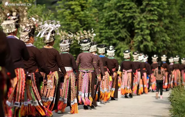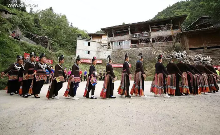In Maniao Village of Paidiao Town in Danzhai County of Qiandongnan Miao and Dong Autonomous Prefecture, southwest China's Guizhou Province, People of Miao ethnic group gathered on Tuesday to perform traditional Miao dance.