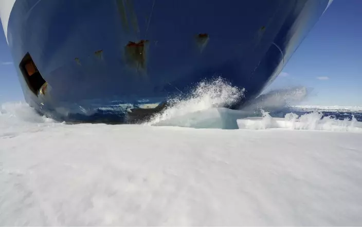 The MSV Nordica is equipped with several heavy-duty engines and a hardened bow and hull that allow it either to drive through thin layers of ice or to crush thicker sheets by rising onto the ice with the help of its rounded hull. The ship's massive weight breaks the ice from above.