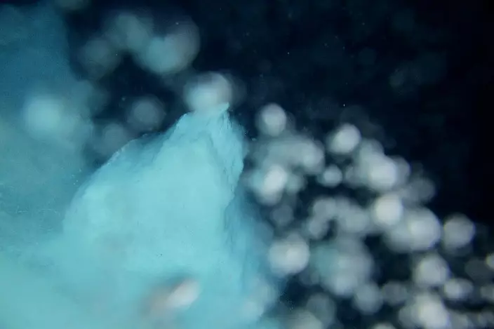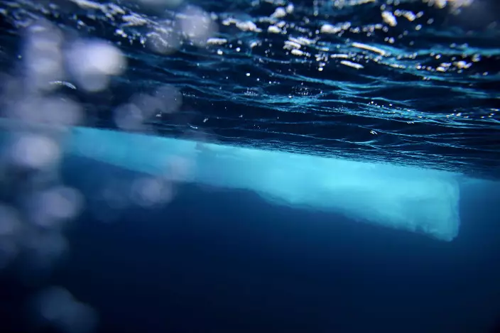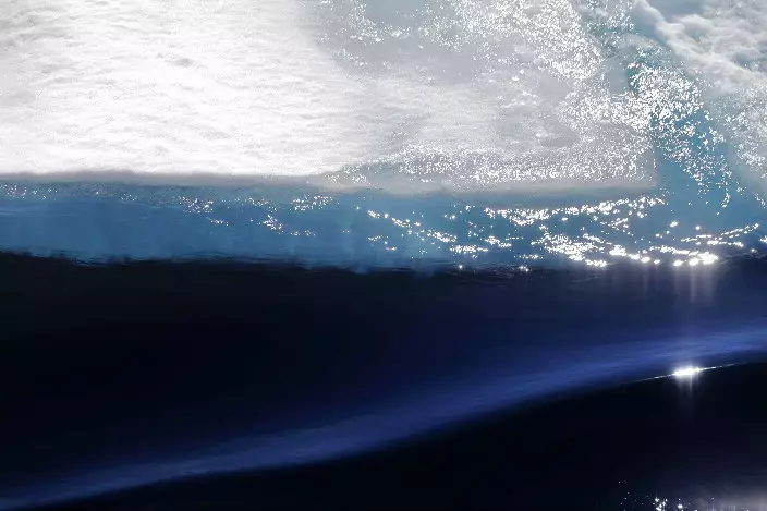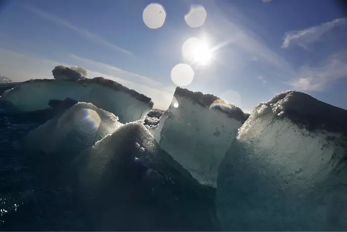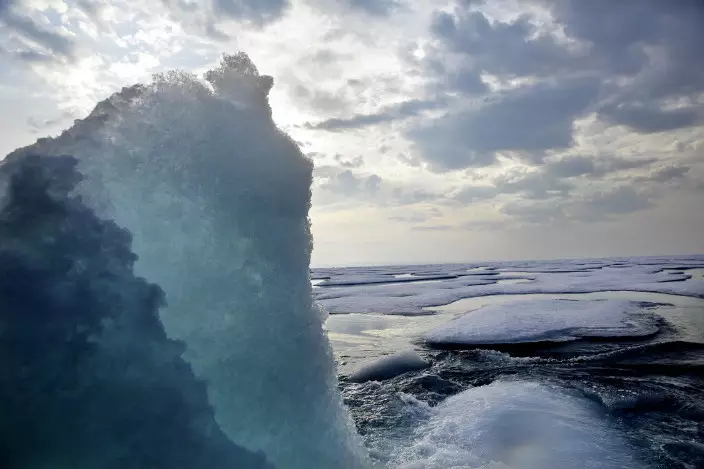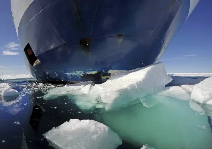 The bow of the Finnish icebreaker MSV Nordica drives through sea ice as it sails the Victoria Strait while traversing the Arctic's Northwest Passage, Friday, July 21, 2017.