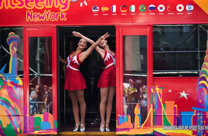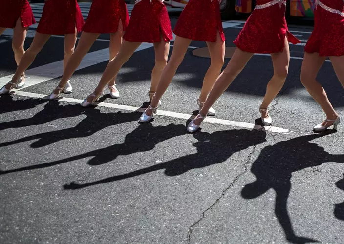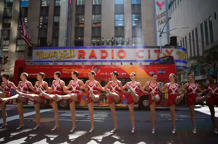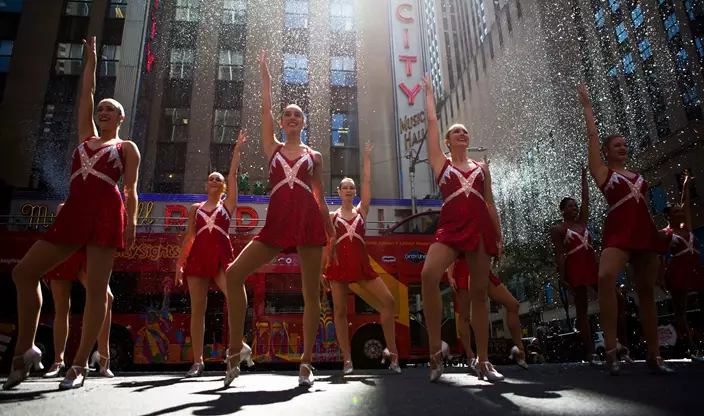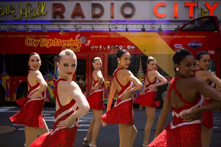 The Radio City Rockettes perform in front of Radio City Music Hall on Thursday, Aug. 17, 2017, in New York.