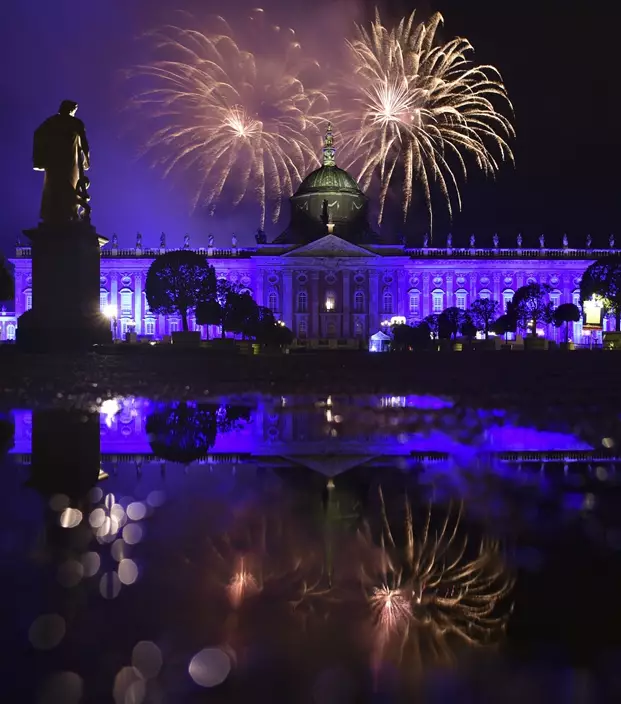 In this Aug. 19, 2017 photo fireworks illuminate the sky above the the park of Sanssouci palace in Potsdam, Germany. (Ralf Hirschberger/dpa via AP)