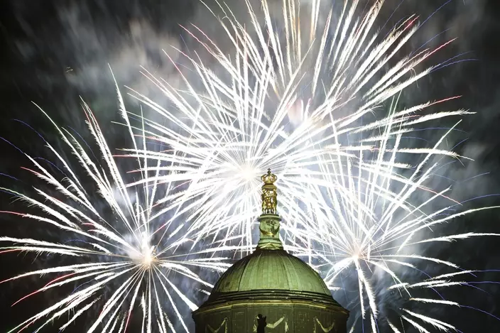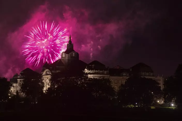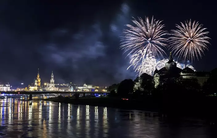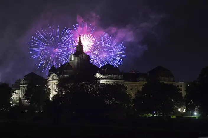 In this Aug. 20, 2017 photo fireworks illuminate the sky during the city festival in Dresden, eastern Germany. (Arno Burgi/dpa via AP)