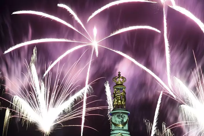 In this Aug. 18, 2017 photo fireworks illuminate the sky after a concert at the Potsdam Castle Night in the Sanssouci park in Potsdam, Germany. (Ralf Hirschberger/dpa via AP)
