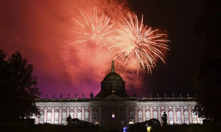 In this Aug. 18, 2017 photo, fireworks illuminate the sky after a concert at the Potsdam Castle Night in the Sanssouci park in Potsdam, Germany. (Ralf Hirschberger/dpa via AP)