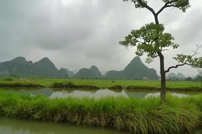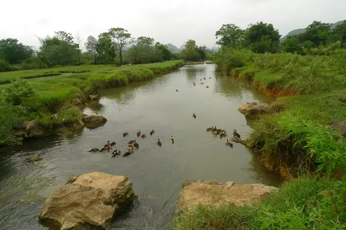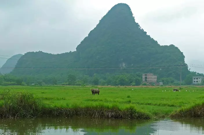 On another day, we left the resort's opposite end, passing through the village next door, called Dashandi, or Big Mountain Base. The group stopped to snap photos of a mother duck leading ducklings down a canal. Down the path, we stopped to take in what seemed like a Chinese watercolor brought to life: water buffalo grazed in a field alongside long-legged birds, as the karst peaks loomed in a hazy background.