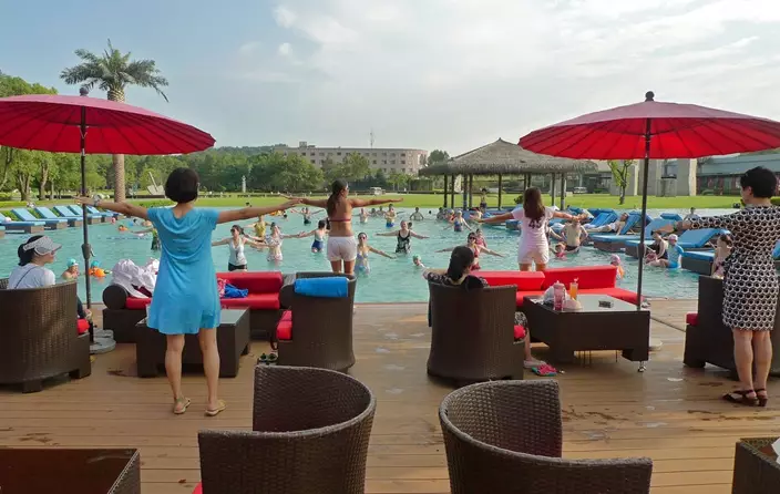 In this Aug. 12, 2016 photo, an instructor leads guests in a fitness class at the Club Med resort in Guilin, China. The Western holiday brand, now owned by a Chinese conglomerate, mostly sticks to its time-tested formula at its Chinese resorts, but has made a few tweaks for Chinese tastes. (AP Photo/Kelvin Chan)