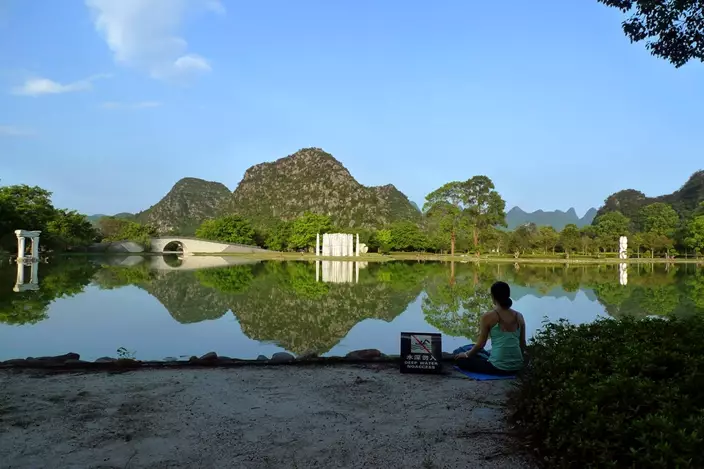 In this Aug. 12, 2016 photo, a woman meditates beside a lake at Club Med's resort in Guilin, China. The company, which operates four resorts in China, was taken over in 2015 by Chinese conglomerate Fosun, which has big ambitions to expand in the global leisure industry. (AP Photo/Kelvin Chan)