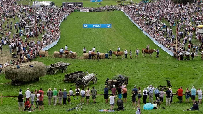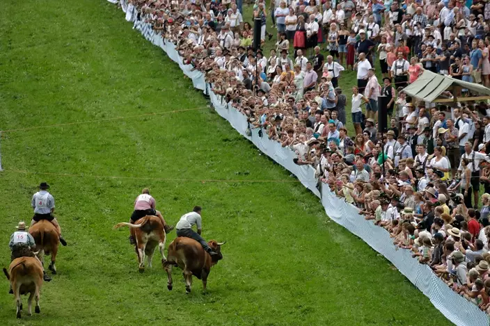 Spectators watch the traditional bull race in the Bavarian village of Haunshofen near Starnberg, Germany, Sunday, Aug. 27, 2017. (AP Photo/Matthias Schrader)