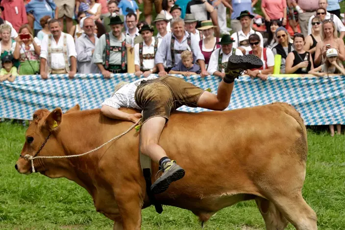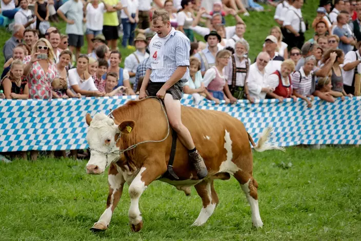 Michael Winterholler rides his bull Bobby during the traditional bull race in the Bavarian village of Haunshofen near Starnberg, Germany, Sunday, Aug. 27, 2017. (AP Photo/Matthias Schrader)
