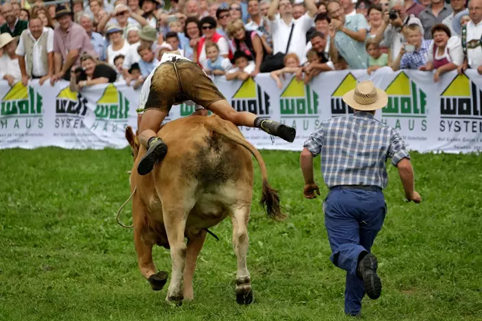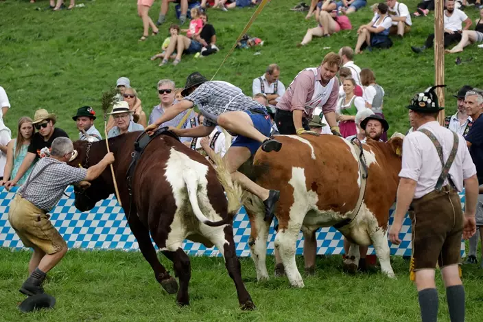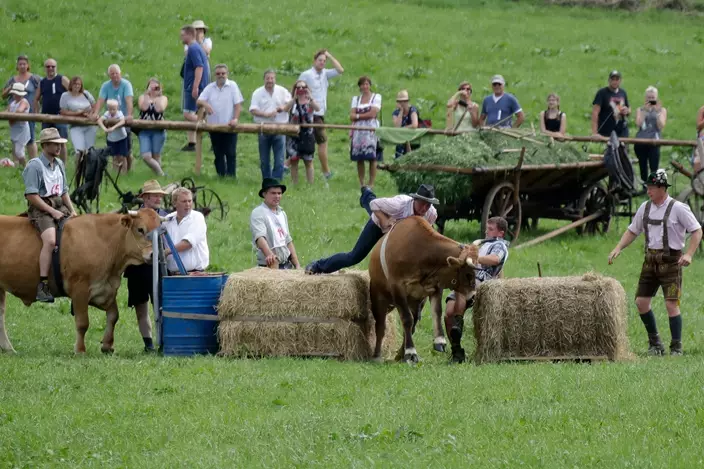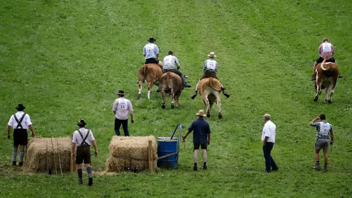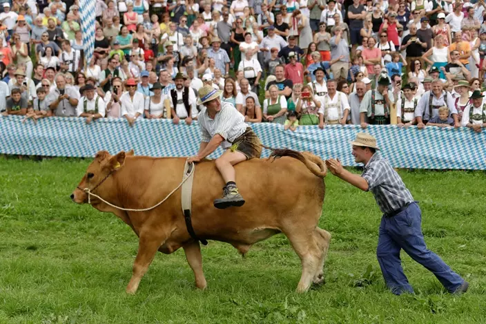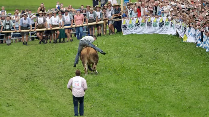 The traditional bull race held in the Bavarian village of Haunshofen near Starnberg, Germany, Sunday, Aug. 27, 2017.