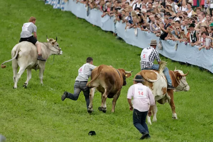 Farmers ride their bulls during the traditional bull race in the Bavarian village of Haunshofen near Starnberg, Germany, Sunday, Aug. 27, 2017. (AP Photo/Matthias Schrader)