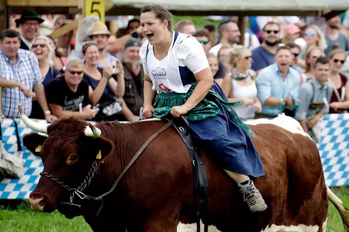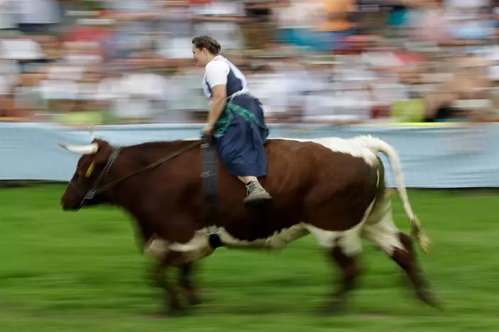 Marlis Kergl rides her bull Seppi during the traditional bull race in the Bavarian village of Haunshofen near Starnberg, Germany, Sunday, Aug. 27, 2017. (AP Photo/Matthias Schrader)