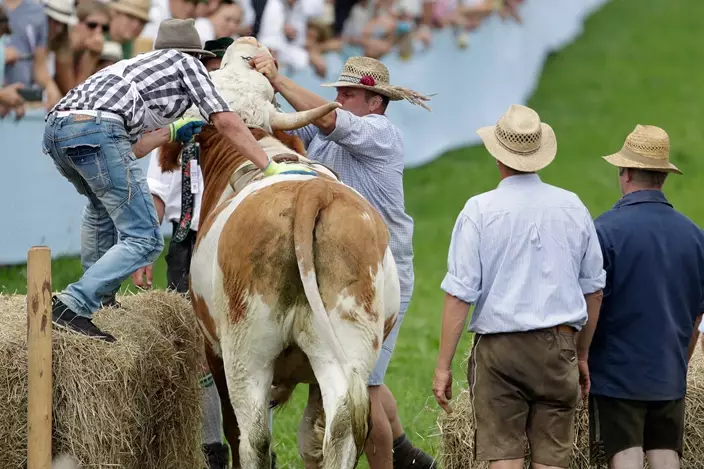 Farmers prepare to ride their bulls during the traditional bull race in the Bavarian village of Haunshofen near Starnberg, Germany, Sunday, Aug. 27, 2017. (AP Photo/Matthias Schrader)