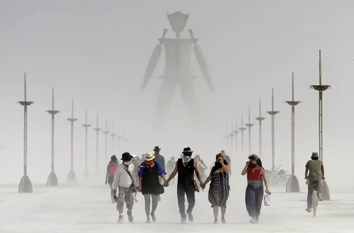 FILE - In this Aug. 29, 2014, file photo, Burning Man participants walk through dust at the annual Burning Man event on the Black Rock Desert of Gerlach, Nev. A Nevada sheriff says a man who ran into the flames at the Burning Man festival's signature burning ceremony has died. (Andy Barron/The Reno Gazette-Journal via AP, File)