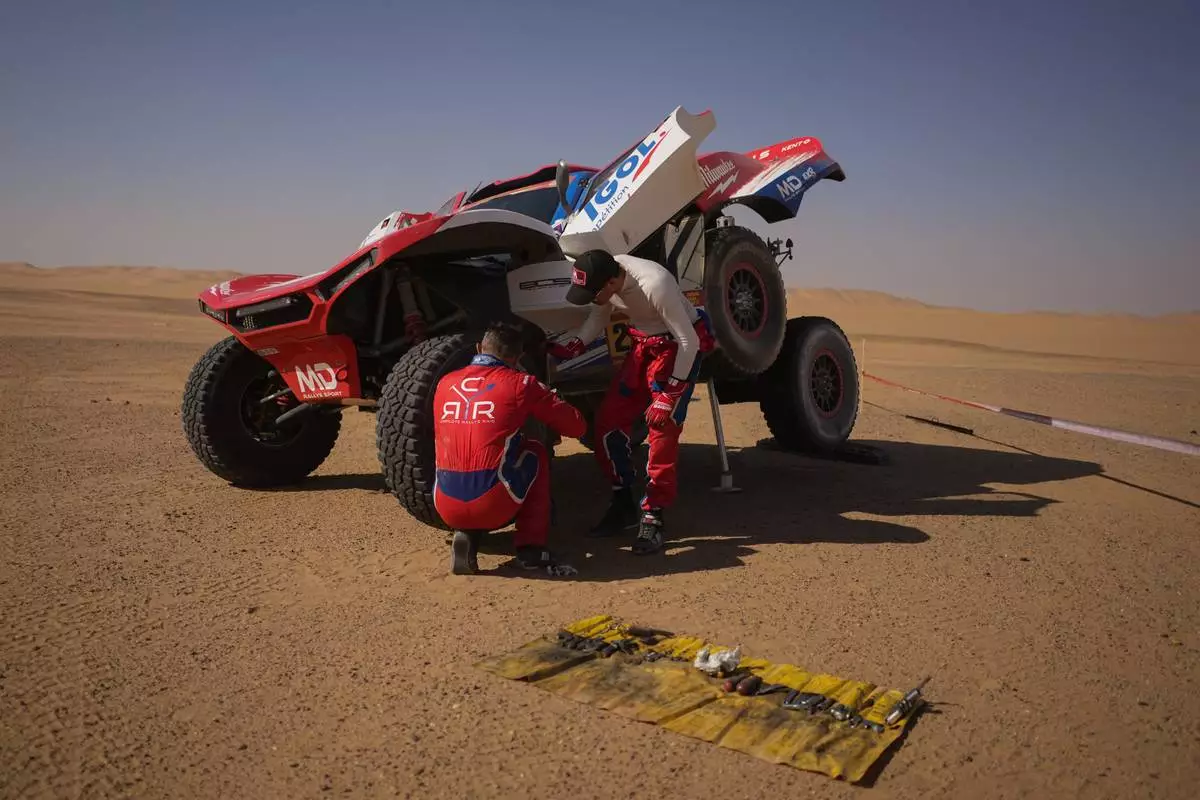 Driver Simon Vitse and co-driver Max Delfino check their car at the end of the ninth stage of the Dakar Rally between Wadi Ad Dawasir and Bisha, Saudi Arabia, Tuesday, Jan.13, 2026. (AP Photo/Thibault Camus)