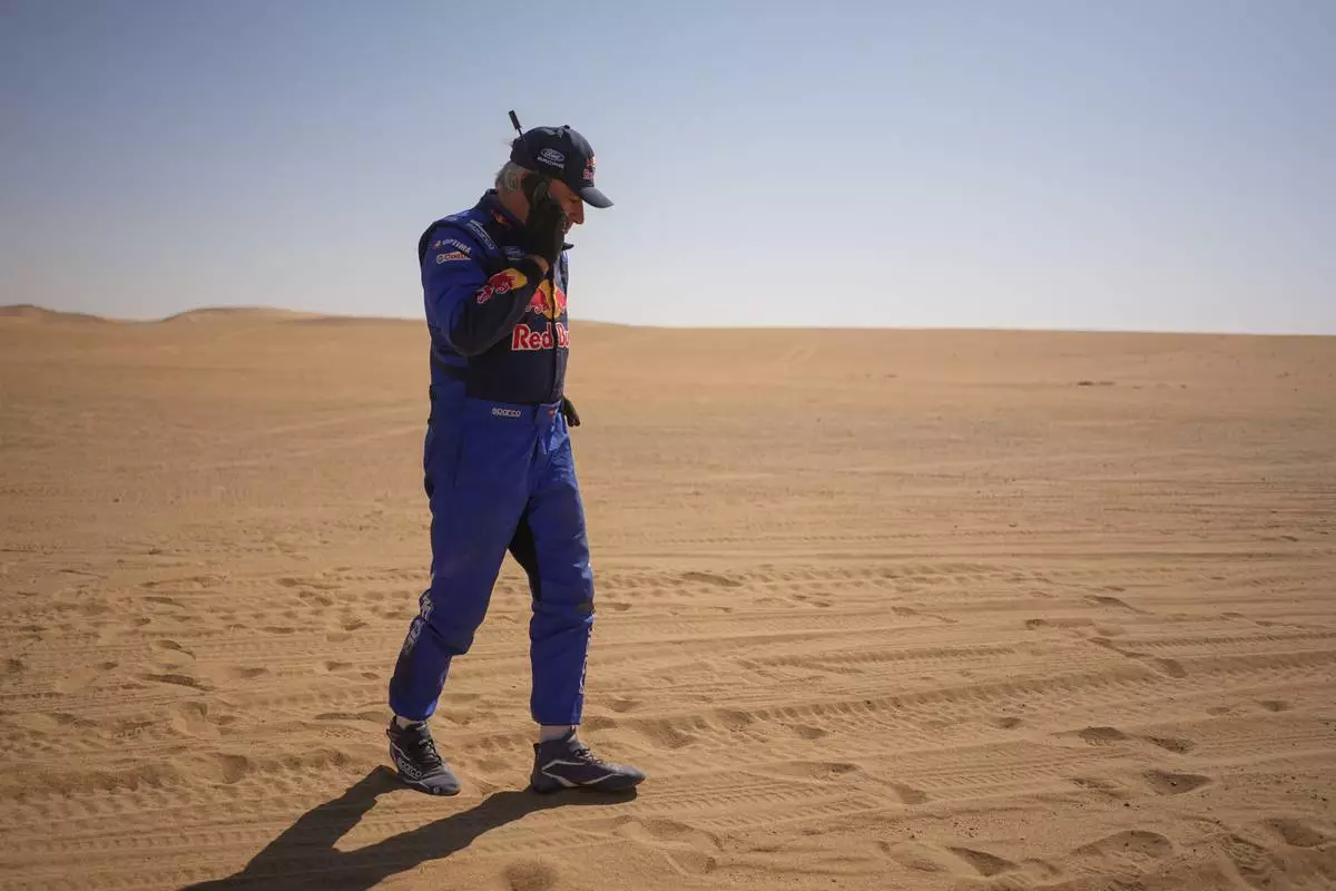 Driver Carlos Sainz gives a phone call at the end of the ninth stage of the Dakar Rally between Wadi Ad Dawasir and Bisha, Saudi Arabia, Tuesday, Jan.13, 2026. (AP Photo/Thibault Camus)