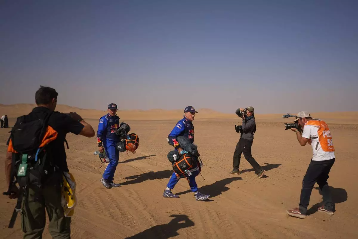 Journalists film driver Carlos Sainz, center, and co-driver Lucas Cruz at the end of the ninth stage of the Dakar Rally between Wadi Ad Dawasir and Bisha, Saudi Arabia, Tuesday, Jan.13, 2026. (AP Photo/Thibault Camus)