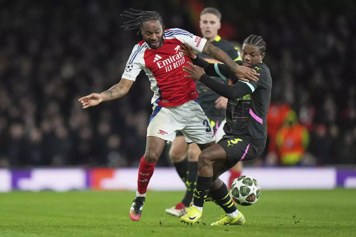 FILE - PSV's Tyrell Malacia, right, challenges for the ball with Arsenal's Raheem Sterling during the Champions League round of 16 second leg soccer match between Arsenal FC and PSV Eindhoven at the Arsenal stadium in London, England, Wednesday, March 12, 2025. (AP Photo/Alastair Grant, File)