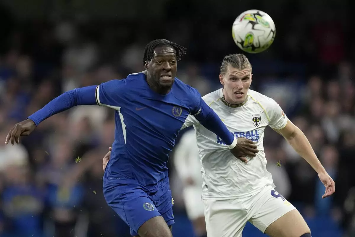 FILE - AFC Wimbledon's Josh Davison, right, challenges Chelsea's Axel Disasi during the English League Cup second round soccer match between Chelsea and AFC Wimbledon at Stamford Bridge stadium in London, Wednesday, Aug. 30, 2023. (AP Photo/Kin Cheung, File)