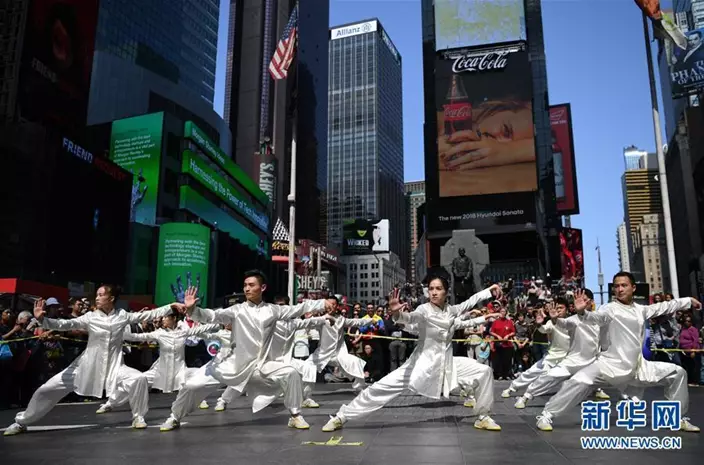 Members of the Zhao Changjun martial arts team perform at Times Square.(Photo/Xinhua)