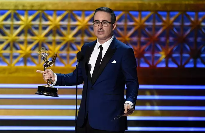 John Oliver accepts the award for outstanding writing for a variety series for "Last Week Tonight with John Oliver" at the 69th Primetime Emmy Awards on Sunday, Sept. 17, 2017, at the Microsoft Theater in Los Angeles. (Photo by Chris Pizzello/Invision/AP)