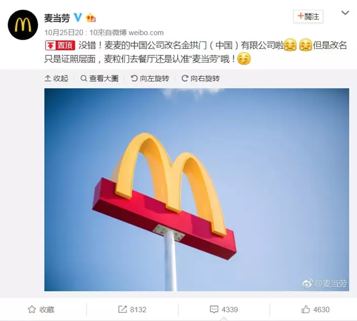 McDonald’s, through its official Weibo account, confirmed on Wednesday evening that it has changed its Chinese company name from "Maidanglao" to "Jingongmen," or “Golden Arches.”