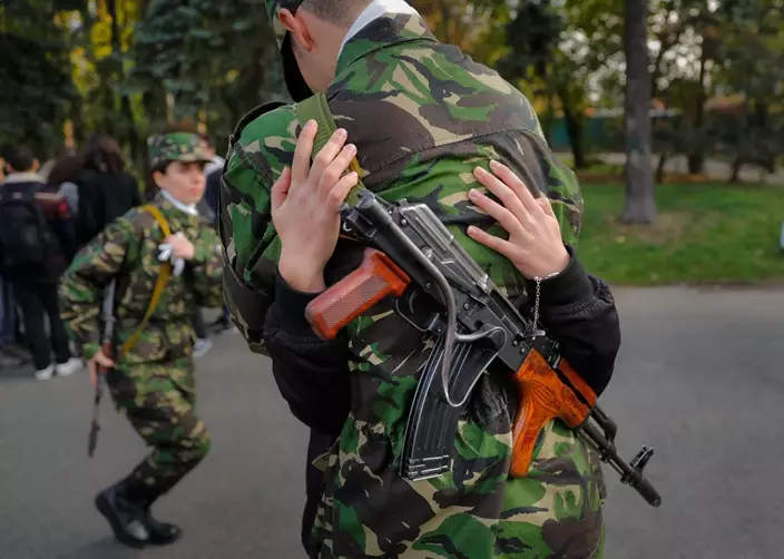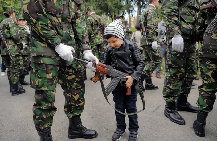 A child holds his brother's weapon before the swearing in ceremony for the military students, in Bucharest, Romania, Wednesday, Oct. 25, 2017. The Romanian Army is celebrating their Army Day and marking 100-years since the landmark battle of Marasesti, a key World War I battle in 1917 when Romanian and Russian soldiers defeated German troops, halting a German offensive. (AP Photo/Vadim Ghirda)
