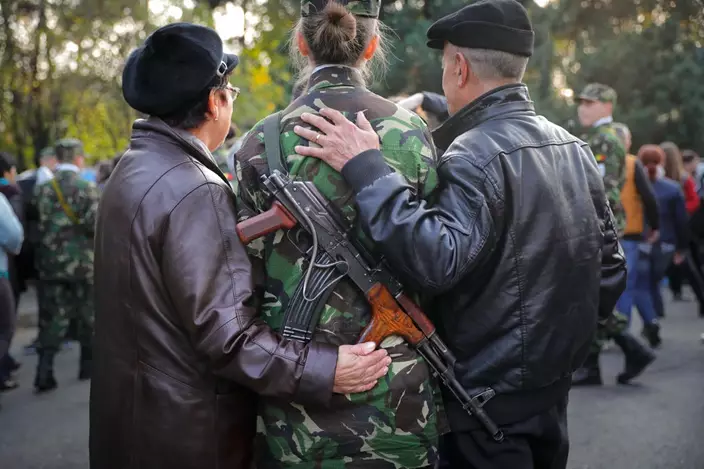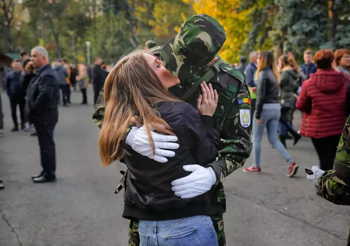 A girl hugs her boyfriend after the swearing in ceremony for the military students, as they prepare to leave for their units, in Bucharest, Romania, Wednesday, Oct. 25, 2017. The Romanian Army is celebrating their Army Day and marking 100-years since the landmark battle of Marasesti, a key World War I battle in 1917 when Romanian and Russian soldiers defeated German troops, halting a German offensive. (AP Photo/Vadim Ghirda)