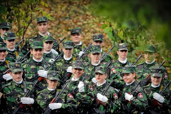 Military student pose for a group photograph before the swearing in ceremony for the military students, in Bucharest, Romania, Wednesday, Oct. 25, 2017. Romania celebrated Army Day and 100 years from a landmark WWI victory against advancing German troops in 1917. (AP Photo/Vadim Ghirda)