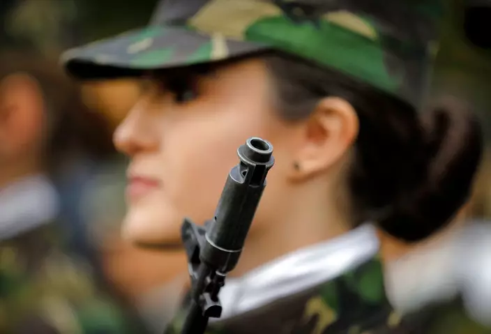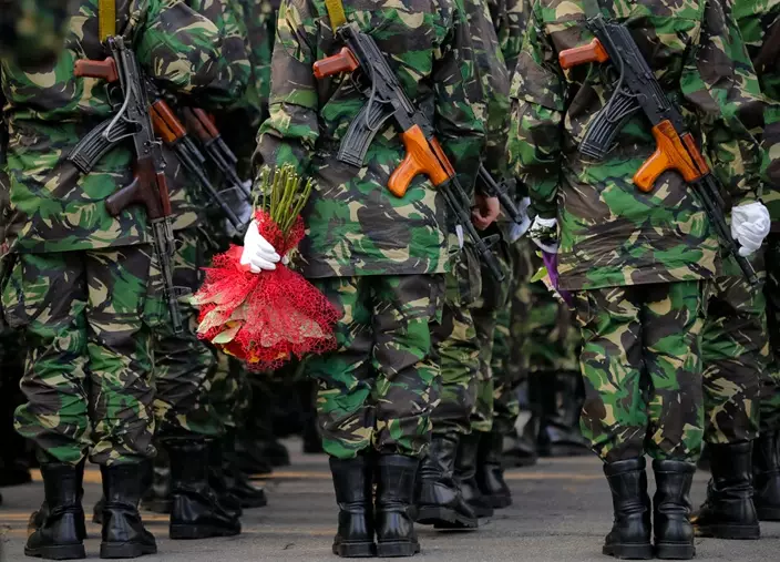 Students, one holding flowers, wait in formation after the swearing in ceremony for the military students, in Bucharest, Romania, Wednesday, Oct. 25, 2017. The Romanian Army is proudly celebrating their Army Day and marking 100-years since the landmark battle of Marasesti, a key World War I battle in 1917 when Romanian and Russian soldiers defeated German troops, halting a German offensive. (AP Photo/Vadim Ghirda)
