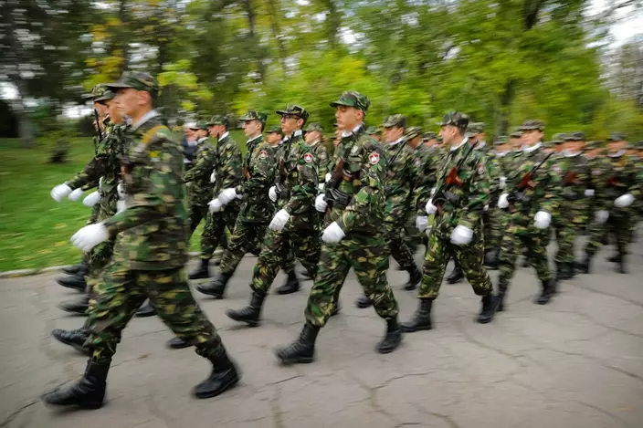 Students march during the swearing in ceremony for the military students, in Bucharest, Romania, Wednesday, Oct. 25, 2017. The Romanian Army is proudly celebrating their Army Day and marking 100-years since the landmark battle of Marasesti, a key World War I battle in 1917 when Romanian and Russian soldiers defeated German troops, halting a German offensive. (AP Photo/Vadim Ghirda)
