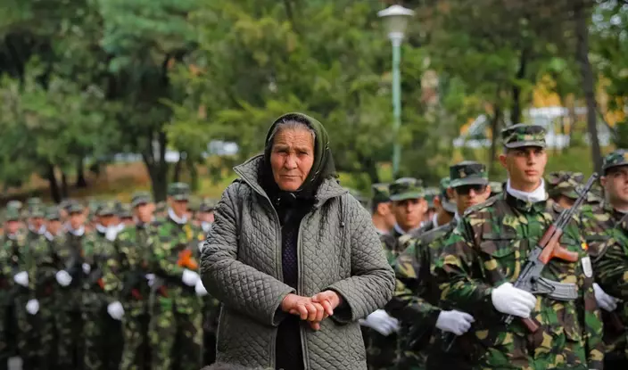 An elderly woman watches students march during the swearing in ceremony for the military students, in Bucharest, Romania, Wednesday, Oct. 25, 2017. The Romanian Army is proudly celebrating their Army Day and marking 100-years since the landmark battle of Marasesti, a key World War I battle in 1917 when Romanian and Russian soldiers defeated German troops, halting a German offensive. (AP Photo/Vadim Ghirda)