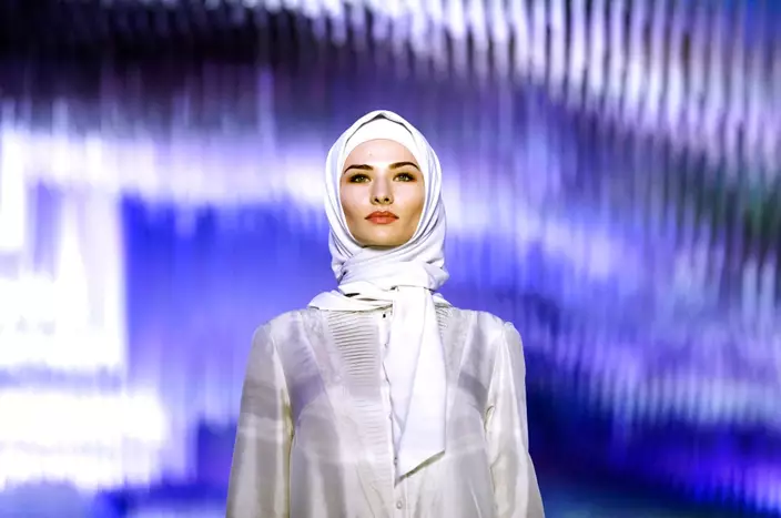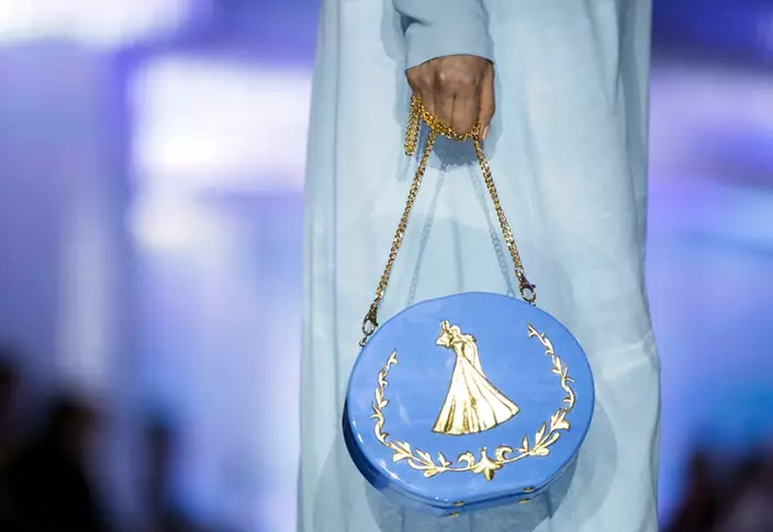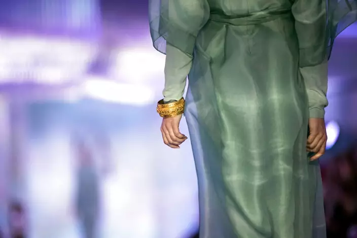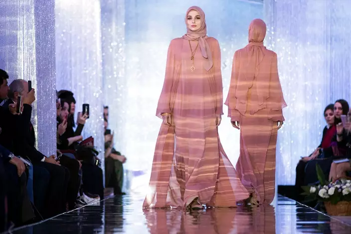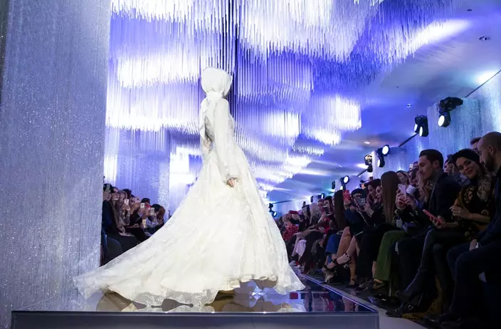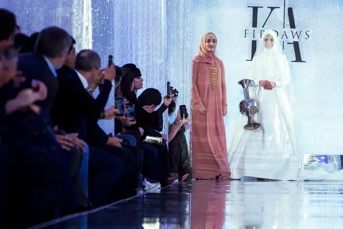 Model presented creations by fashion designer Aishat Kadyrov, daughter of Chechen regional leader Ramzan Kadyrov, in the Zaryadye Park in Moscow, Russia, Tuesday, Oct. 24, 2017.