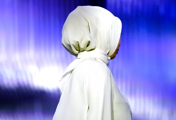 A model presents a creation by fashion designer Aishat Kadyrov, daughter of Chechen regional leader Ramzan Kadyrov, in the Zaryadye Park in Moscow, Russia, Tuesday, Oct. 24, 2017. (AP Photo/Pavel Golovkin)