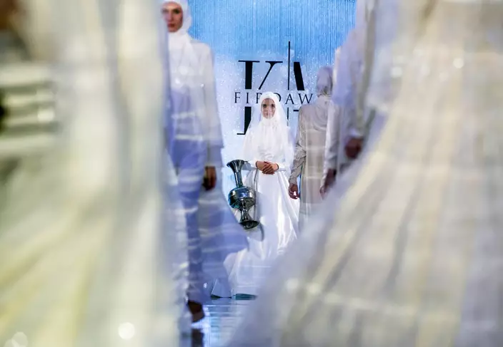 Models present creations by fashion designer Aishat Kadyrov, daughter of Chechen regional leader Ramzan Kadyrov, in the Zaryadye Park in Moscow, Russia, Tuesday, Oct. 24, 2017. (AP Photo/Pavel Golovkin)
