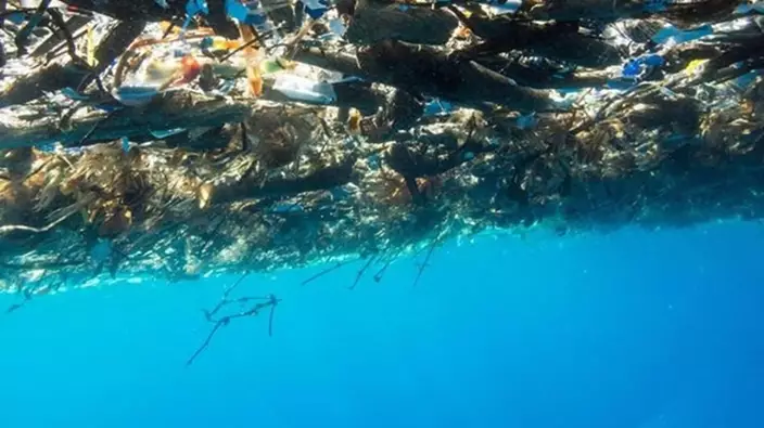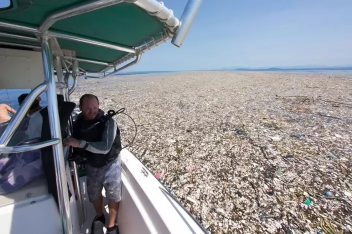 The massive area of floating waste is mainly consisting of plastic made bottles and cutleries, and the explorer said they had to sail over 5 miles to cross the polluted area.