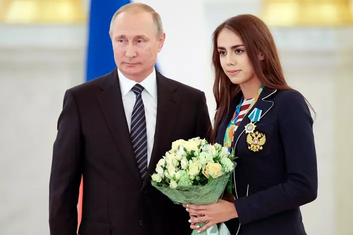 FILE - In this file photo dated Thursday, Aug. 25, 2016, Russian President Vladimir Putin, left, poses with Margarita Mamun. (AP Photo/Ivan Sekretarev, FILE)