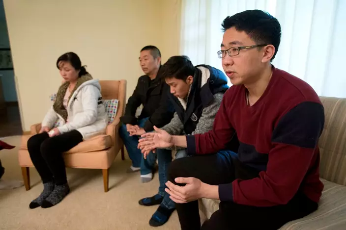 Xiaolin Hou, foreground, the boyfriend Yingying Zhang, a missing University of Illinois at Urbana-Champaign student, talks about her disappearance, accompanied by her parents, Lifeng Ye, left, Ronggao Zhang, and her brother, Xinyang Zhang, in Urbana, Ind., Wednesday, Nov. 1, 2017. Studying in America was a longtime dream for Yingying and “she loved her stay here,” said Hou, who was in touch with her every day via WeChat, a popular social network in China. (AP Photo/Michael Conroy)