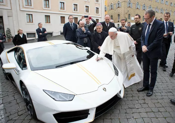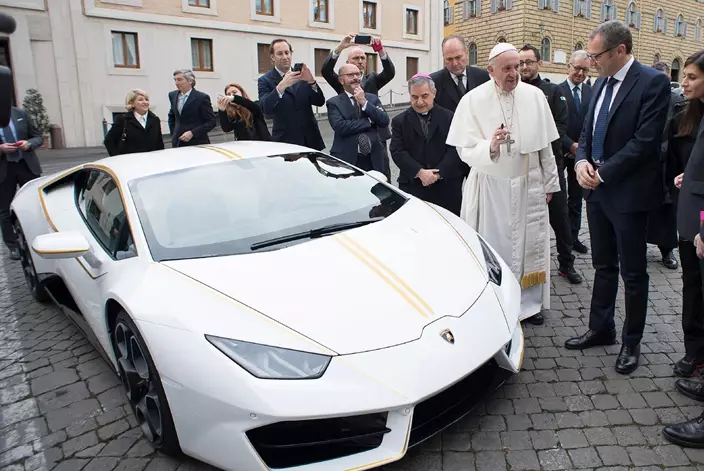 Pope Francis blesses a Lamborghini donated to him by the luxury sports car maker, at the Vatican, Wednesday, Nov. 15, 2017.(L'Osservatore Romano/Pool Photo via AP)