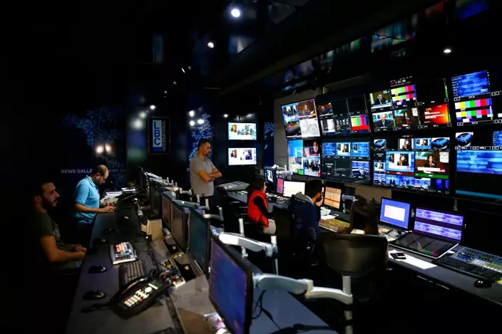 In this picture taken Wednesday, Nov. 15, 2017, a general view shows the master control room at the LBC TV station in Beirut, Lebanon.(AP Photo/Hassan Ammar)