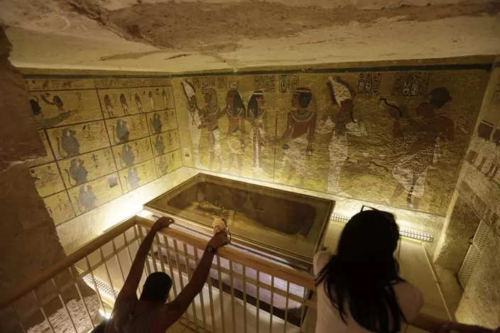 CORRECTS MONTH OF THE TOUR IN LOS ANGELES TO MARCH FROM JANUARY - FILE - In this Thursday, Nov. 5, 2015, file photo, tourists look at the tomb of King Tut as it is displayed in a glass case at the Valley of the Kings in Luxor. (AP Photo/Amr Nabil, File)