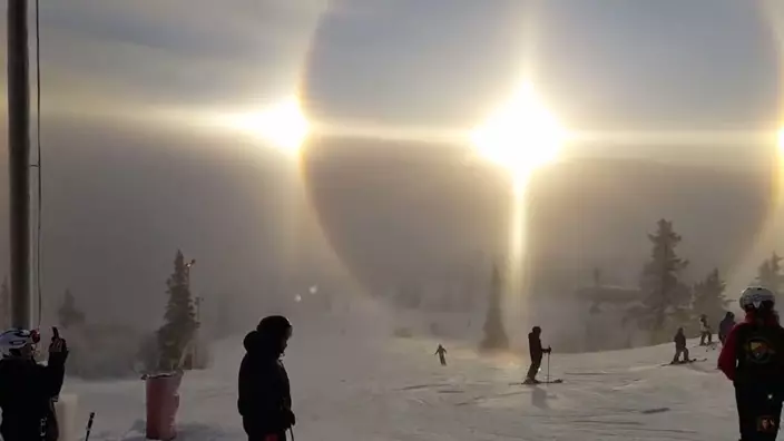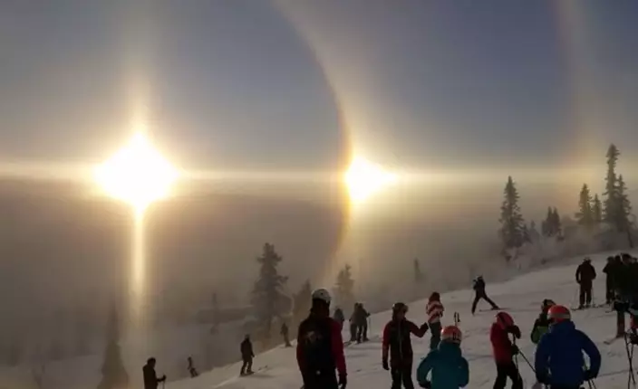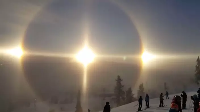 This fantastic range of halo phenomena was filmed by Ludvig Lundin in the Swedish ski resort of Vemdalen. Such dramatic displays usually occur naturally only in polar regions where the ice crystals of frozen fog, known as ‘diamond dust’, refract and reflect the sunlight like tiny prisms.