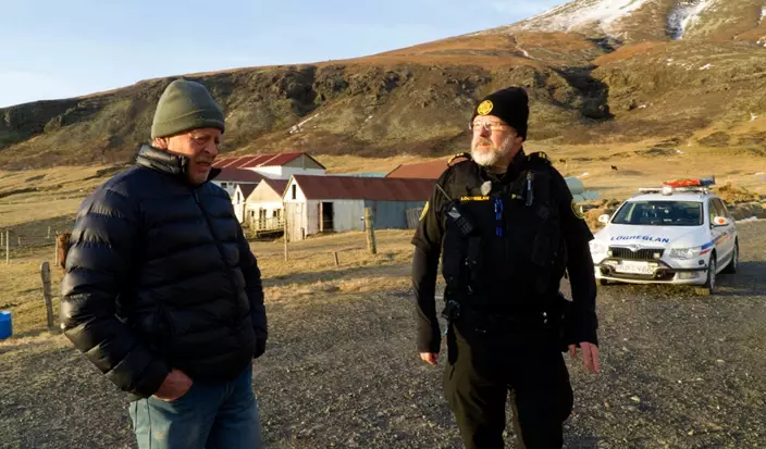 Police inspector Adolf Arnason talks with a local farmer living at the foot of Oraefajokull volcano in Iceland, Thursday, Nov. 30, 2017. (AP Photo/David Keyton)