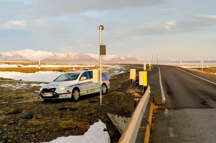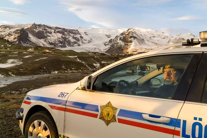 A police car is parked by the side of the road at the foot of Oraefajokull volcano in Iceland, Thursday, Nov. 30, 2017. . (AP Photo/David Keyton)