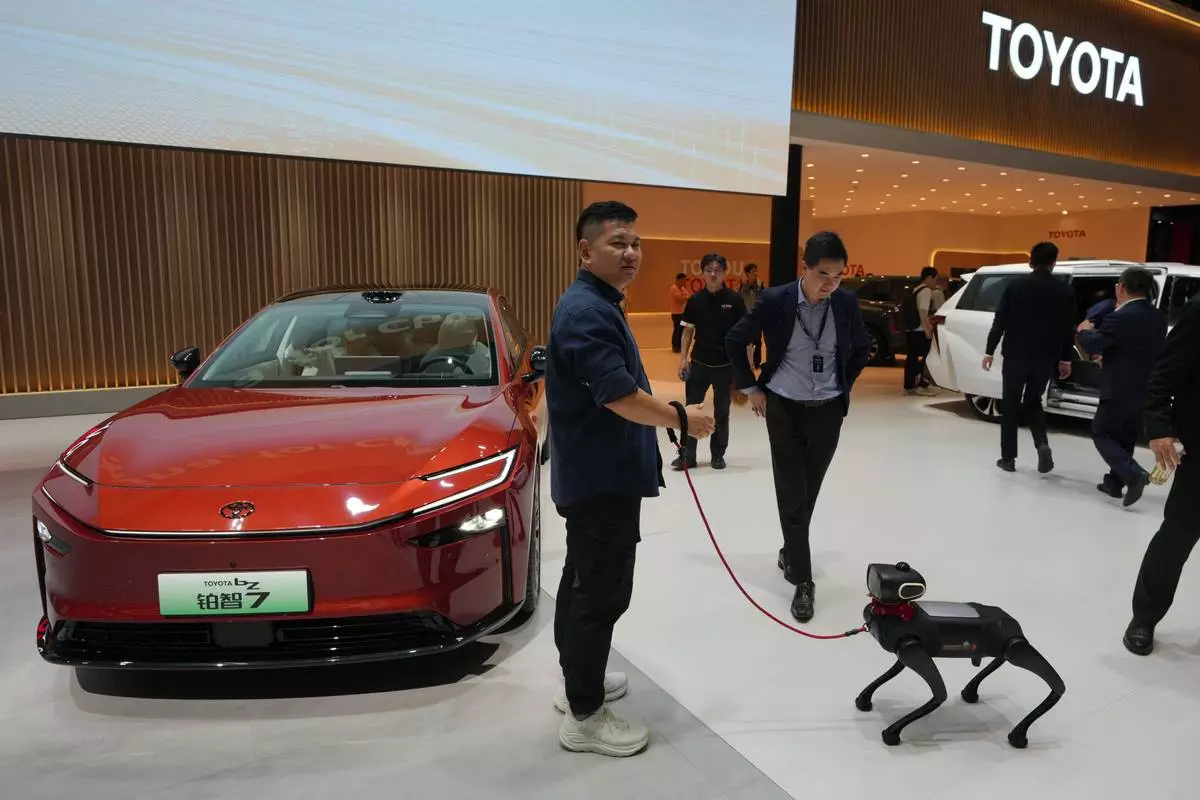 A visitor and his robotic dog stand near to the Toyota BZ7 EV model showcased at the Auto China 2026, in Beijing, Friday, April 24, 2026. (AP Photo/Andy Wong)