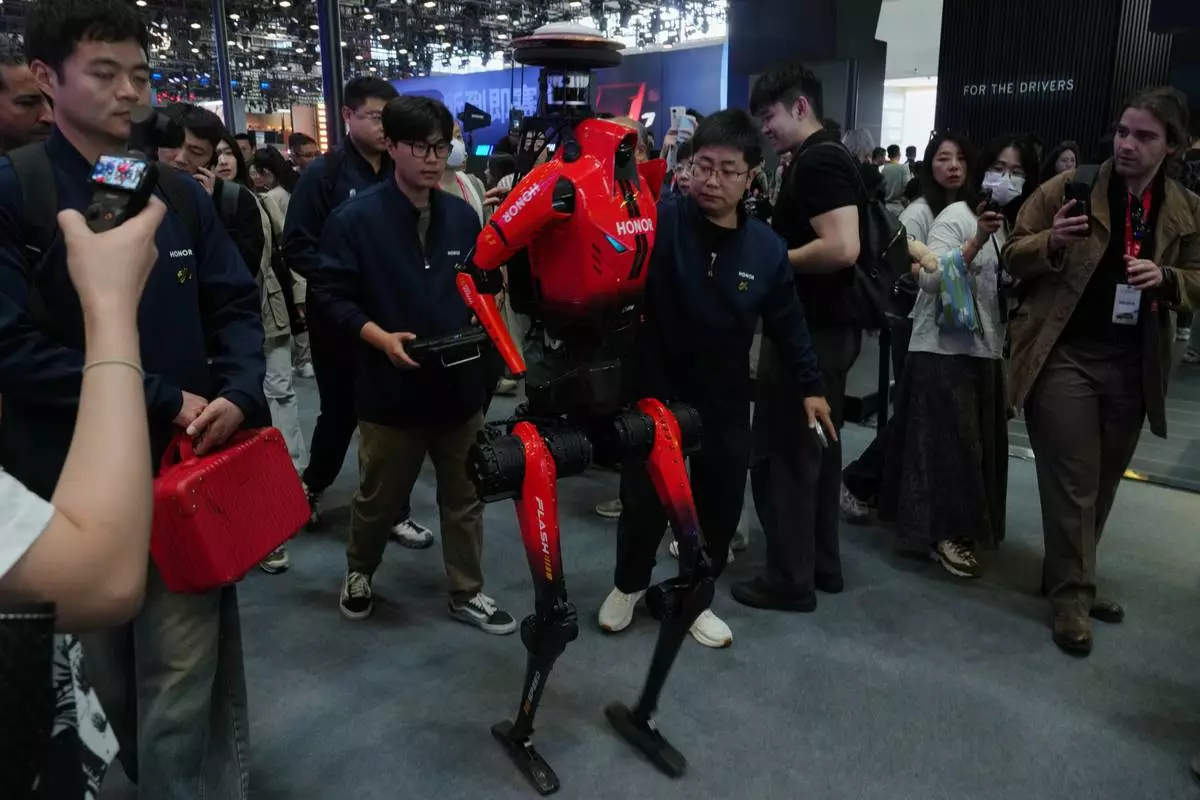 Honor, the humanoid robot which has won the humanoid robot half-marathon last weekend is surrounded by visitors as it visiting the Auto China 2026, in Beijing, Friday, April 24, 2026. (AP Photo/Andy Wong)