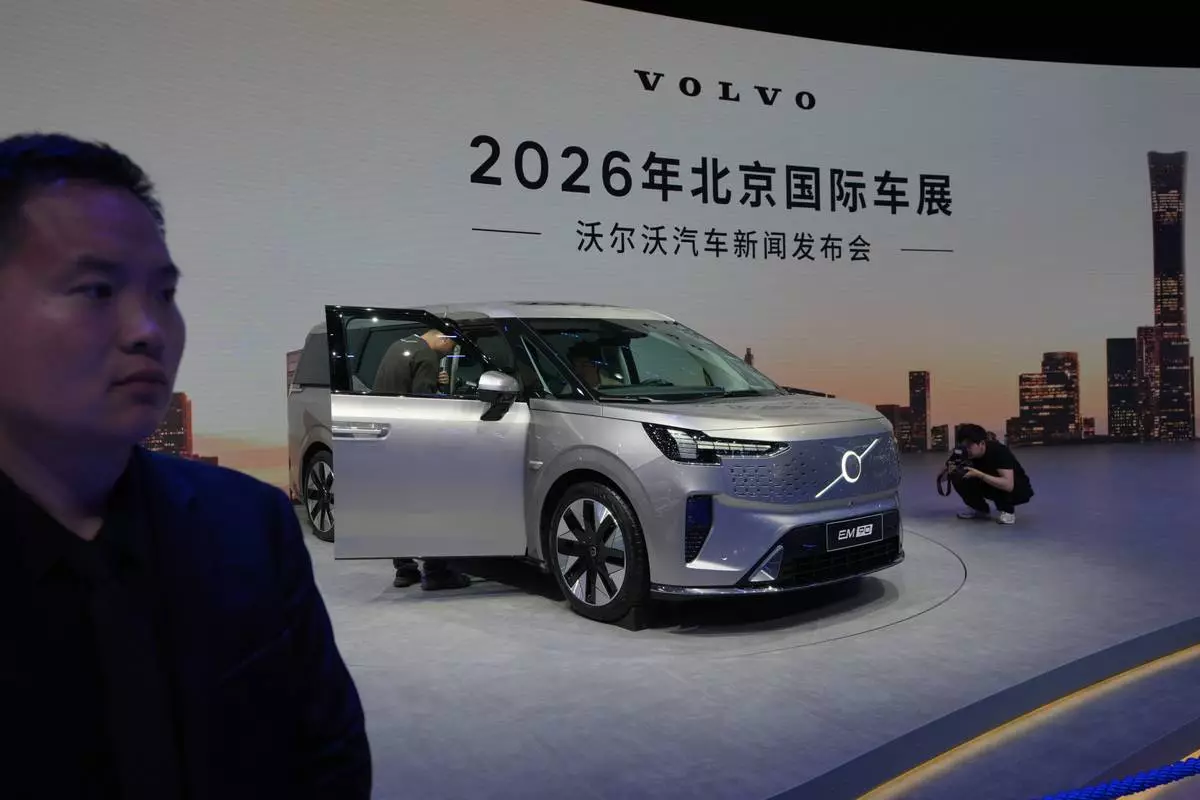 A security stands watch as visitors look at the Volvo EM90 model showcased at the Auto China 2026, in Beijing, Friday, April 24, 2026. (AP Photo/Andy Wong)
