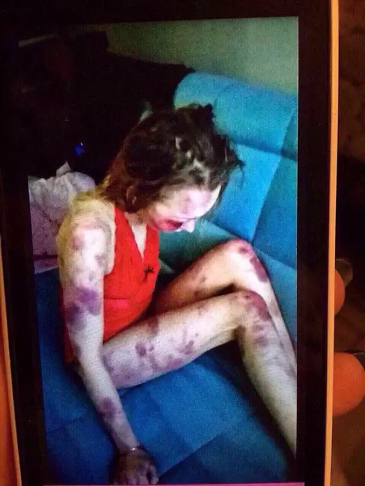 The video shows serious injuries all over Ovsiannikova's body. She sits on the sofa and looks intensely exhausted.