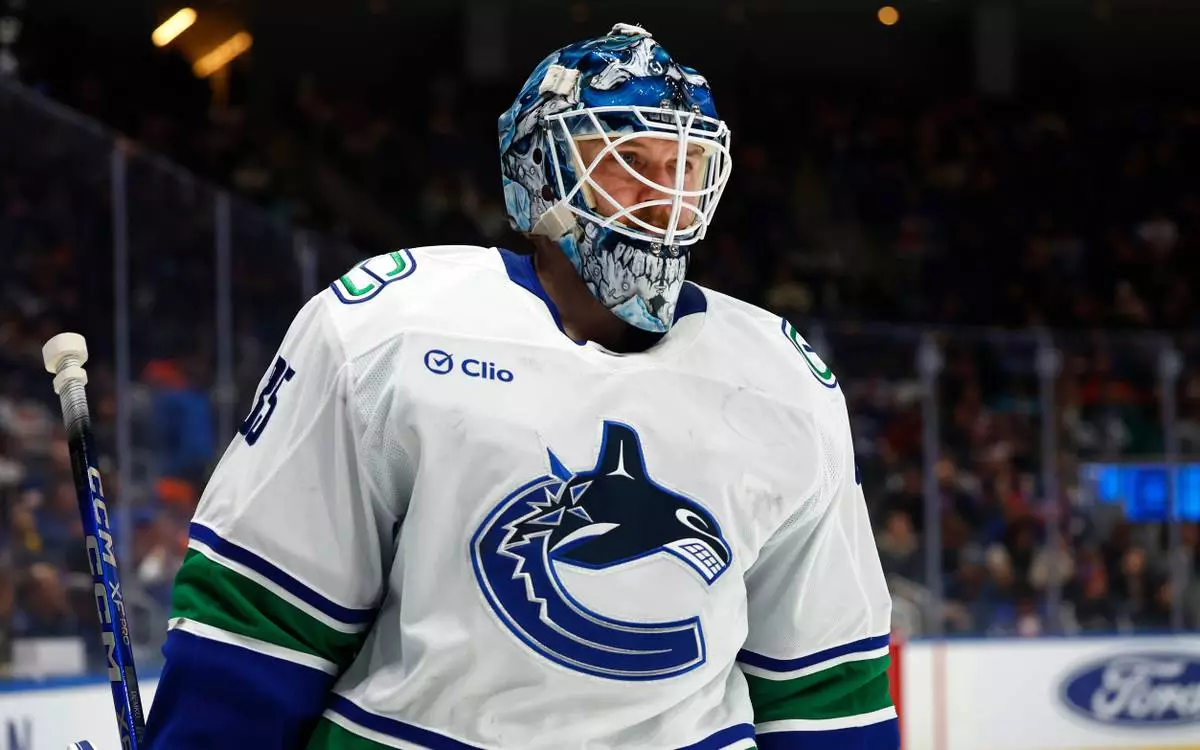 Vancouver Canucks goaltender Thatcher Demko looks on during the second period of an NHL hockey game against the New York Islanders, Friday, Dec. 19, 2025, iin Elmont, NY. (AP Photo/Noah K. Murray)