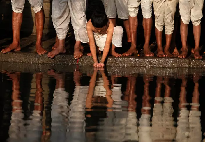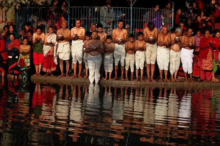 Nepalese Hindu devotees offer prayers along the banks of the Hanumante river during the Madhav Narayan Festival in Bhaktapur, Nepal, Tuesday, Jan. 2, 2018. (AP Photo/Niranjan Shrestha)